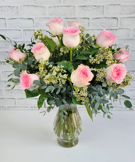 Premium Long Stem Light Pink Mondial Roses with Greenery in a Vase